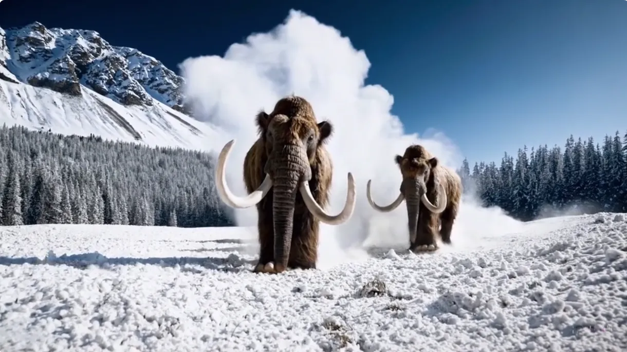 示例2: 几只巨大的长毛猛犸象踏过一片雪白的草地,它们长长的毛发在微风中轻轻飘动着,远处覆盖着雪的树木和雄伟的雪山,午后的光线下有些薄云,太阳高悬在远方,营造出温暖的光芒。
