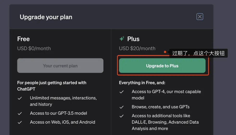 2. 在弹出的窗口中,点击「Upgrade To Plus」