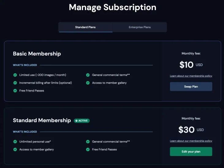 除了月费 10 美元及 30 美元的标准方案外,MidJourney 最近还推出了年费 600 美元的企业方案。如果你打算以公司的方式商业使用 MidJourney,可以考虑这个企业方案。