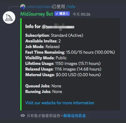 显示账号信息。如果是未订阅的账号,只会显示剩余的生成次数;如果已订阅,则会显示订阅方案、剩余的邀请码、生成模式(Relaxed 或 Fast)、Fast 模式剩余时数、图片可见性(Public 或 Private)等信息。