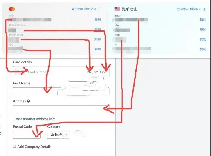 开通成功之后就可以使用虚拟信用卡来订阅服务啦,直接在订阅的地方,把卡片的信息复制粘贴进去就行了。