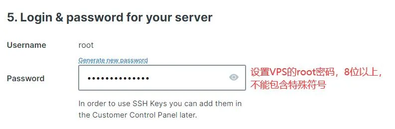 设置 VPS 的 root 登录密码,需满足 8 位以上且无特殊符号的要求。