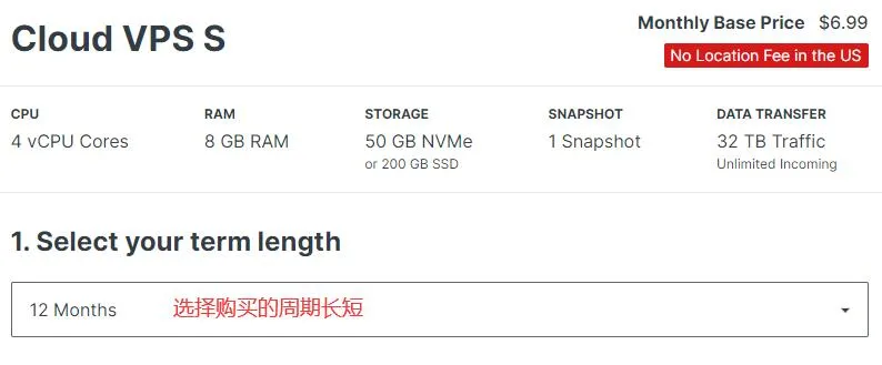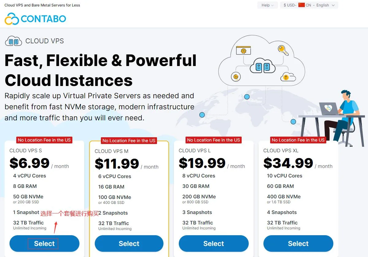 通过 Contabo 官网 进入官网。根据需求选择套餐,这里以 “CLOUD VPS S” 的最低价套餐为例。