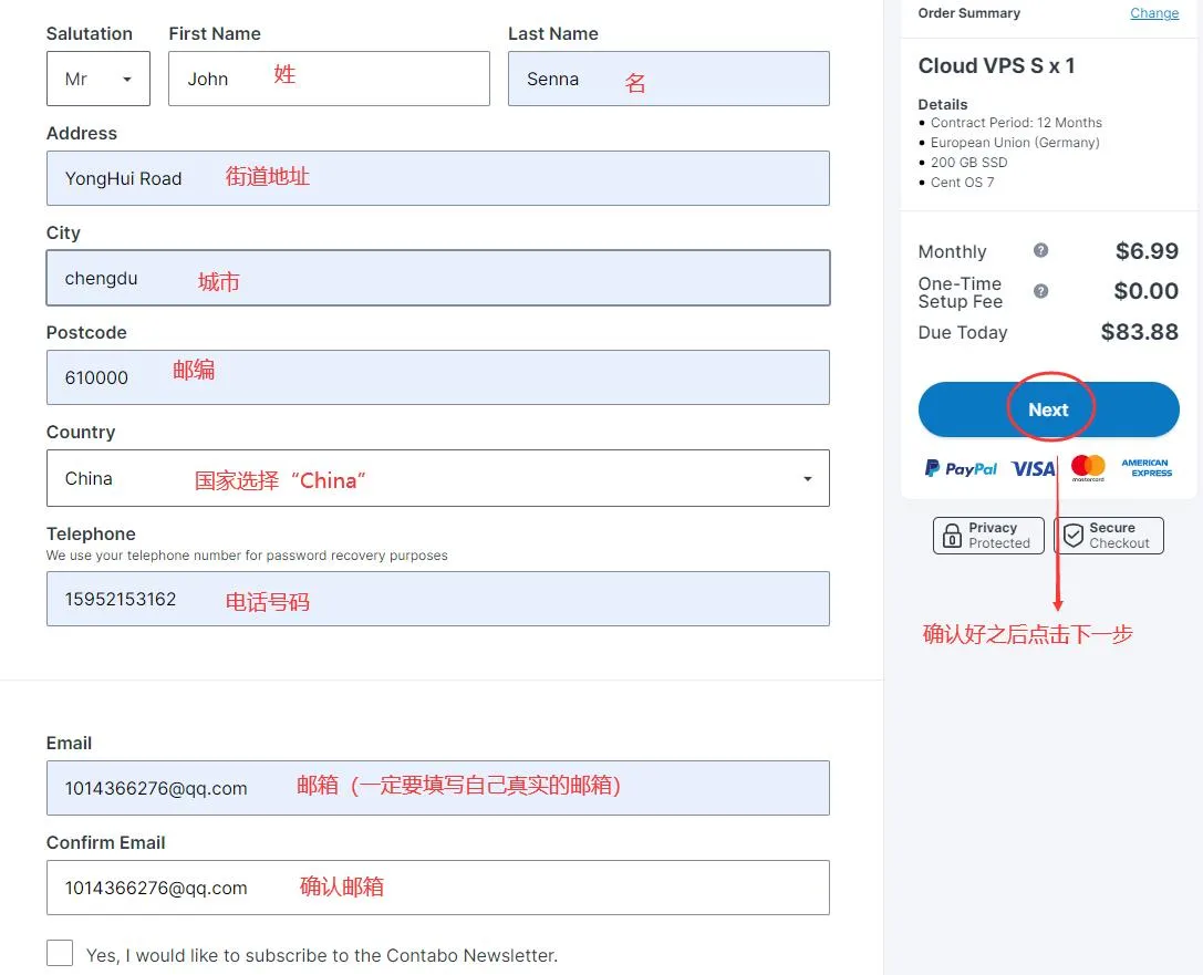 使用英文填写用户信息,确保邮箱地址正确(需接收 VPS 账号信息)。