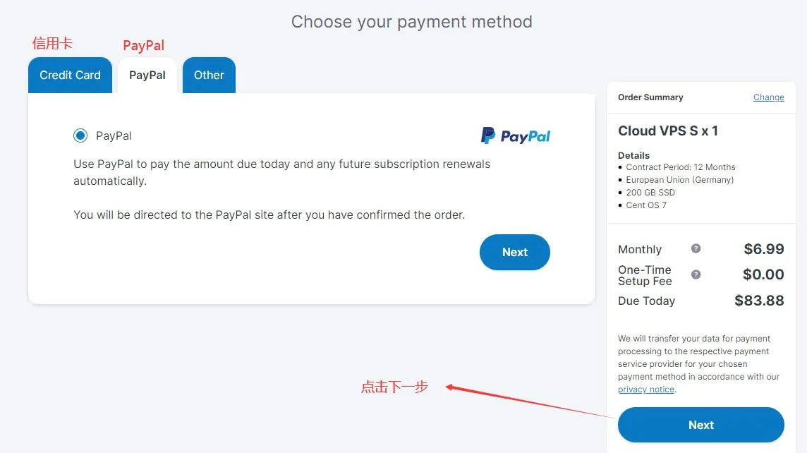 Contabo 支持信用卡或 PayPal 付款。如果没有国际信用卡,建议使用 野卡 虚拟信用卡 完成支付。