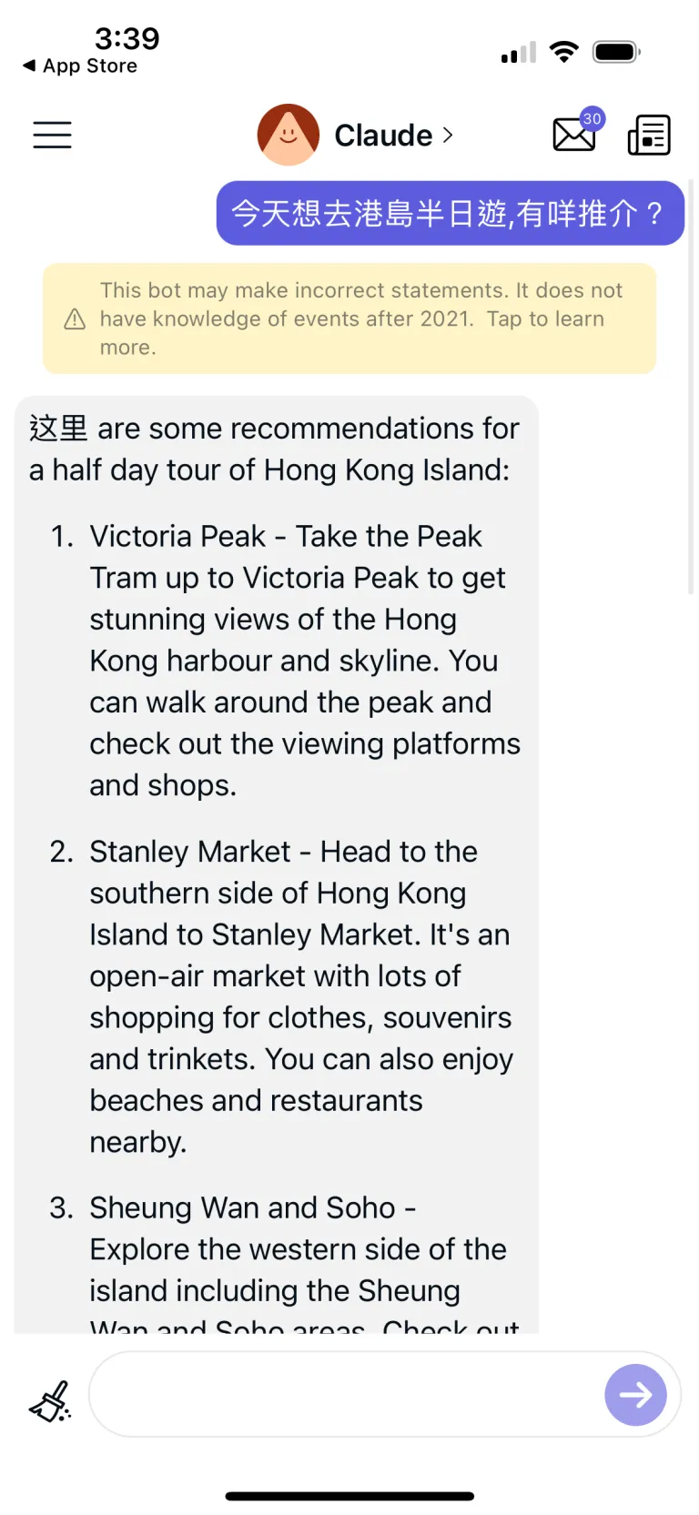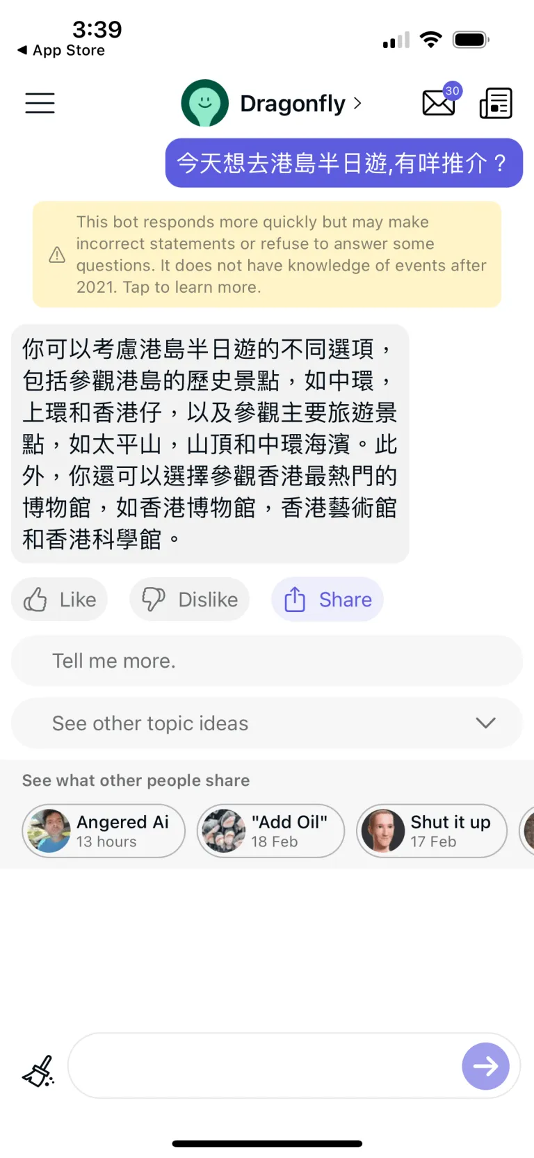 小编实测了关于“今天想去港岛半日游”的问题,比较了三款机器人的回复: