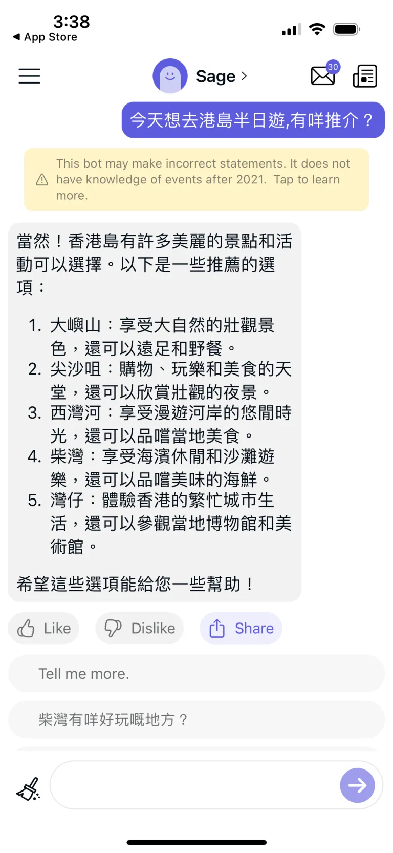 香港用户只需下载由 Quora 研发的手机应用程序 Poe,即可免费体验 ChatGPT。该应用不仅包括 Sage(简易版 ChatGPT),还可以试玩 Google 在 Anthropic 投资了 31 亿元的最新 AI——Claude,以及与 ChatGPT 使用的相同语言模型 Dragonfly 进行对话。