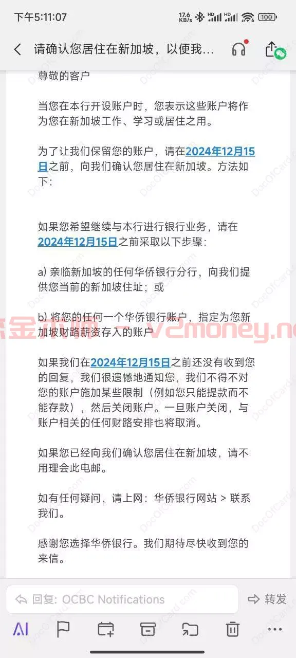 根据用户反馈,无论是老用户还是新开OCBC华侨银行账户的用户,都被要求在12月15日之前提供在新加坡的居住证明,否则账户将被限制使用,最终可能会关闭。