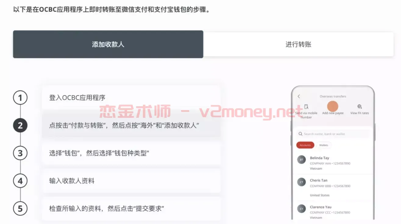 转账方法:打开OCBC应用程序,选择“微信支付”或“支付宝”,添加收款人并在12小时后显示。