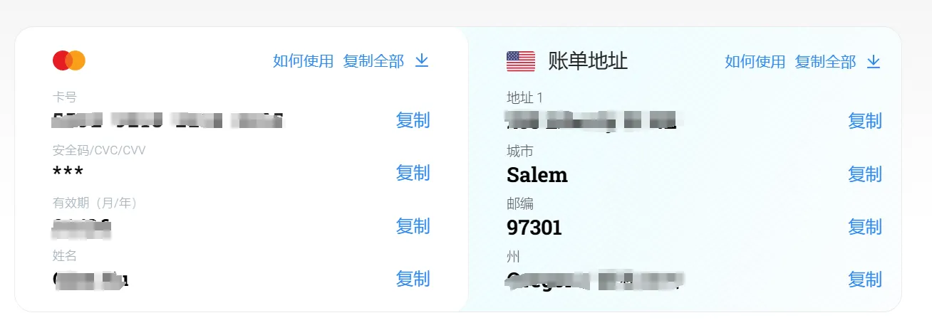 点击添加信用卡,所需信息可在虚拟卡网页上找到,直接复制粘贴即可。