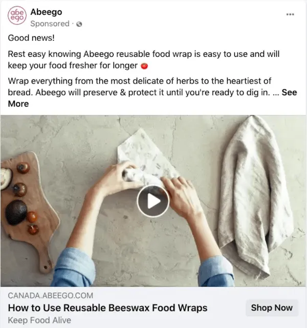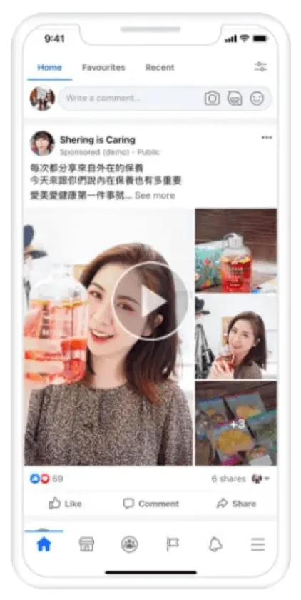 视频广告一般出现在Facebook的新闻和故事板块,也会作为插播形式出现在较长的Facebook视频中。这种类型的广告可以动态展示您的团队、产品或服务。