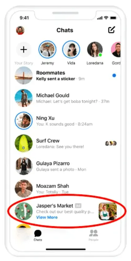 Messenger广告在Facebook Messenger中展示,用户可以通过点击“行动号召”按钮与销售人员或客户服务代表进行一对一交流。
