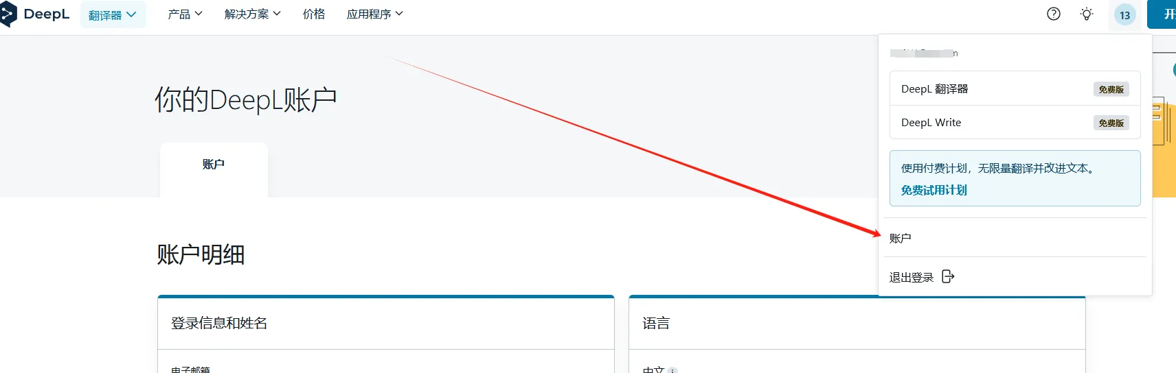 取消订阅非常简单。点击右上角的个人头像,选择 账户,或者直接访问 DeepL 账户管理。