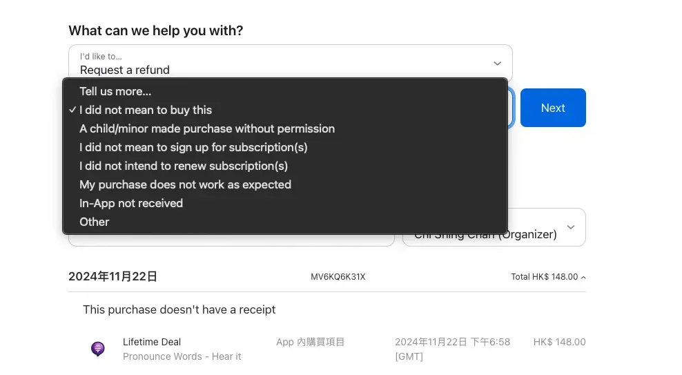 点击“我想”(I’d like to),然后选择“要求退款”。接着,从列表中选择你申请退款的原因,并点击“下一步”。