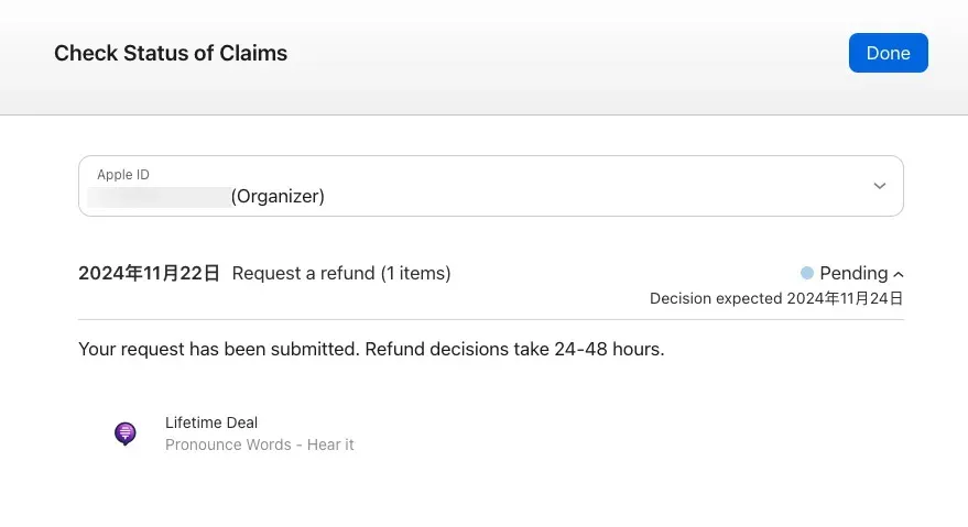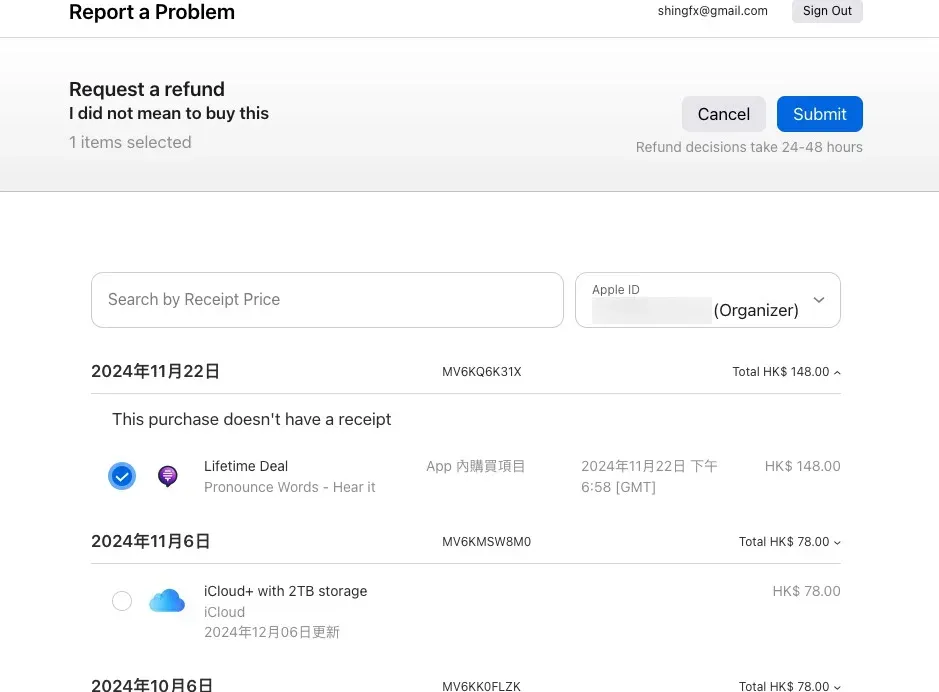 退款申请可能需要经过 Apple 的审核,并不是所有购买都符合退款条件。在提交申请前,请确认选择正确的原因及项目,以提高审核通过的几率。更重要的是,尽快提交申请,不要超过 48 小时。