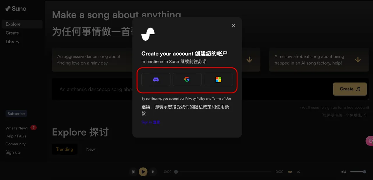 打开上面的入口,点击 Suno 主页面左下角的 Sign up。