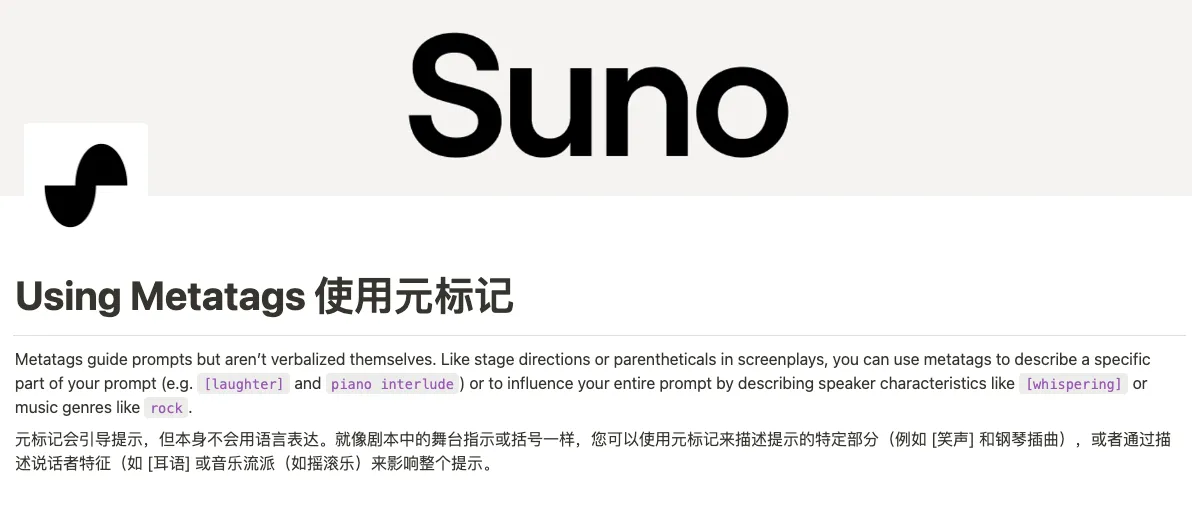 我们可以把元标签(Metatags)理解为在歌词里写的提示语(Prompt),让 AI 歌手能基于这些提示语和歌词,结合曲风建议,来更好创作和演绎歌曲。