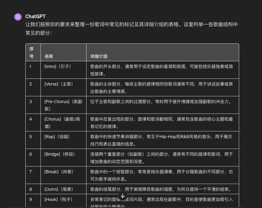 例如:Verse(主歌)、Rap(说唱)、Chorus(副歌/高潮)……