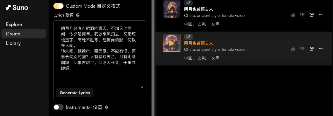 例如:我们将苏轼的《水调歌头·明月几时有》放到歌词(Lyrics)里,风格选择“中国,古风,女声”,歌名就叫《明月也曾照古人》。