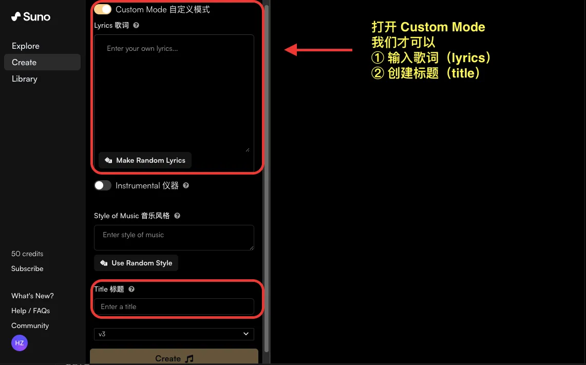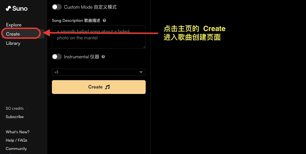 首先,点击 Suno 主页的Create选项,进入歌曲创建界面。