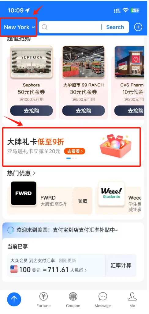 - 切换位置:在支付宝首页将位置切换为纽约,点击“大牌礼卡”。