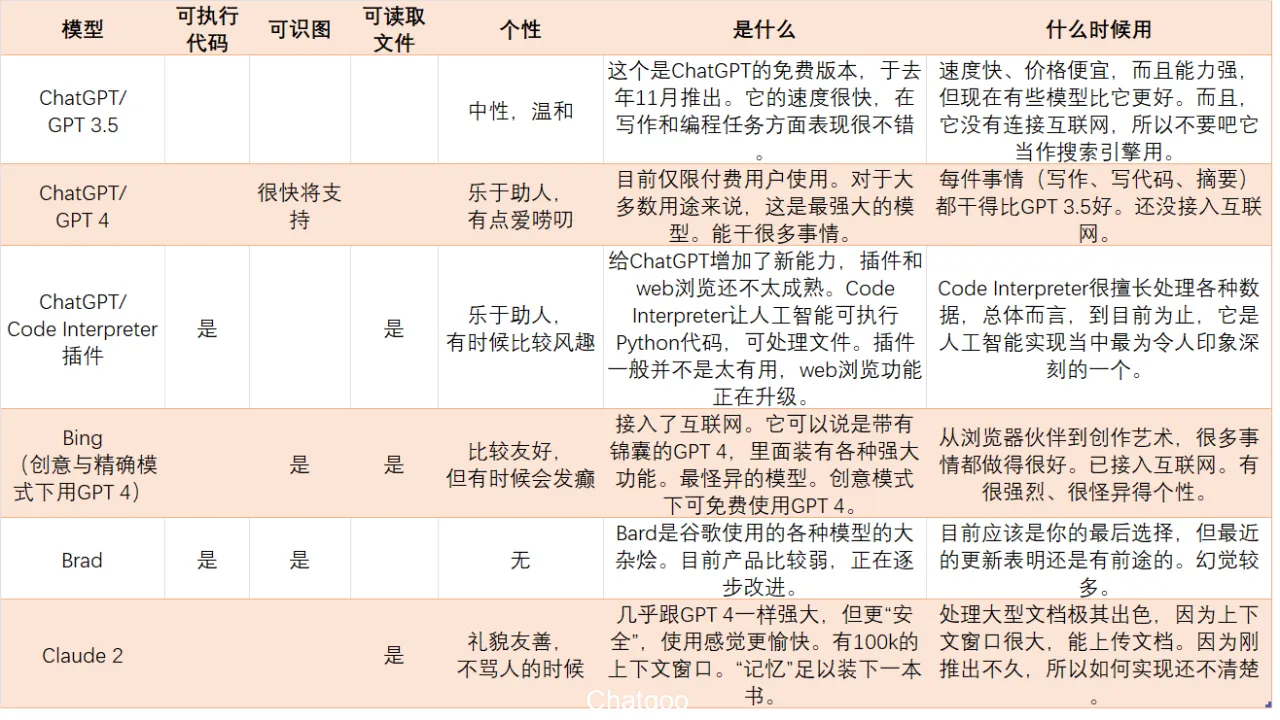 前四个(包括 Bing)都是 OpenAI 的系统。目前 OpenAI 的人工智能主要有这两种:3.5 和 4。GPT-3.5 在去年 11 月引发了一波人工智能热潮,而 GPT-4 在今年春季首次亮相,功能更为强大。新的派生版通过插件接入互联网及其他应用。虽然插件种类繁多,但大多数并不实用,用户应根据需求自行探索。Code Interpreter 是 ChatGPT 的一个强大版本,可以运行 Python 程序。如果你从未为 OpenAI 付费,那么你只接触过 3.5。除了插件版和暂时停止浏览的 GPT-4 版外,这些模型都未连接到互联网。微软的 Bing 混合使用了 4 和 3.5,通常是 GPT-4 家族中第一个推出新功能的模型。Bing 既可以创建和识别图像,也可以在网页浏览器中读取文档,功能强大但使用体验略显奇怪。
