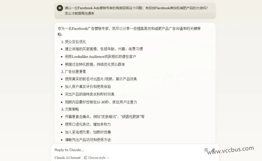 随后,我让Claude回答了一个关于Facebook广告投放的问题,感觉表现一般,没有特别亮眼的地方。