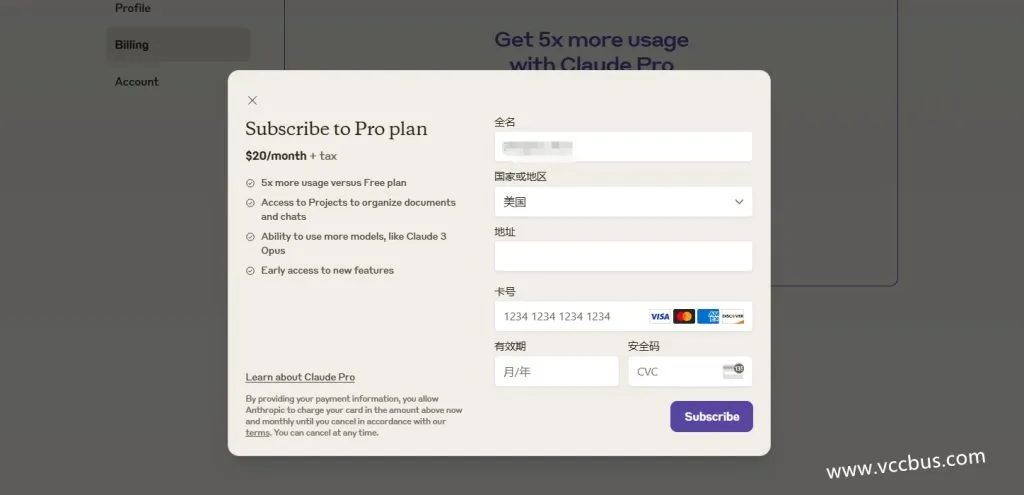 Claude Pro的付费订阅价格为20美元/月,仅支持万事达、Visa、Discover和美国运通等信用卡支付。请注意,某些国家和地区的信用卡可能无法使用,可能会导致付款失败。