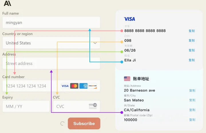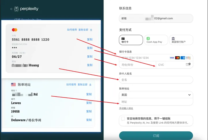 - 将卡片信息填写到 perplexity 绑卡页面。切记!确保余额充足! 绑卡时需要 20 美元的费用,建议您至少保持 21 美元的余额,以确保绑卡成功。