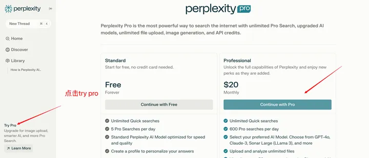 进入 perplexity 官网,点击 “Try Pro”,然后选择要升级的服务。