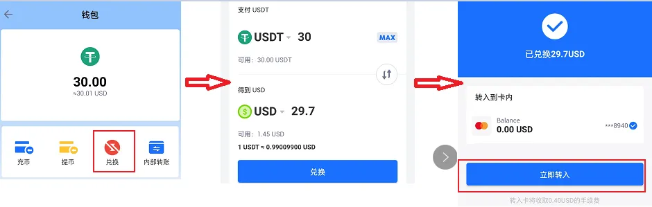 转账成功后,点击Depay钱包 -> 兑换,将USDT兑换成USD美元,然后将美元存入卡中。