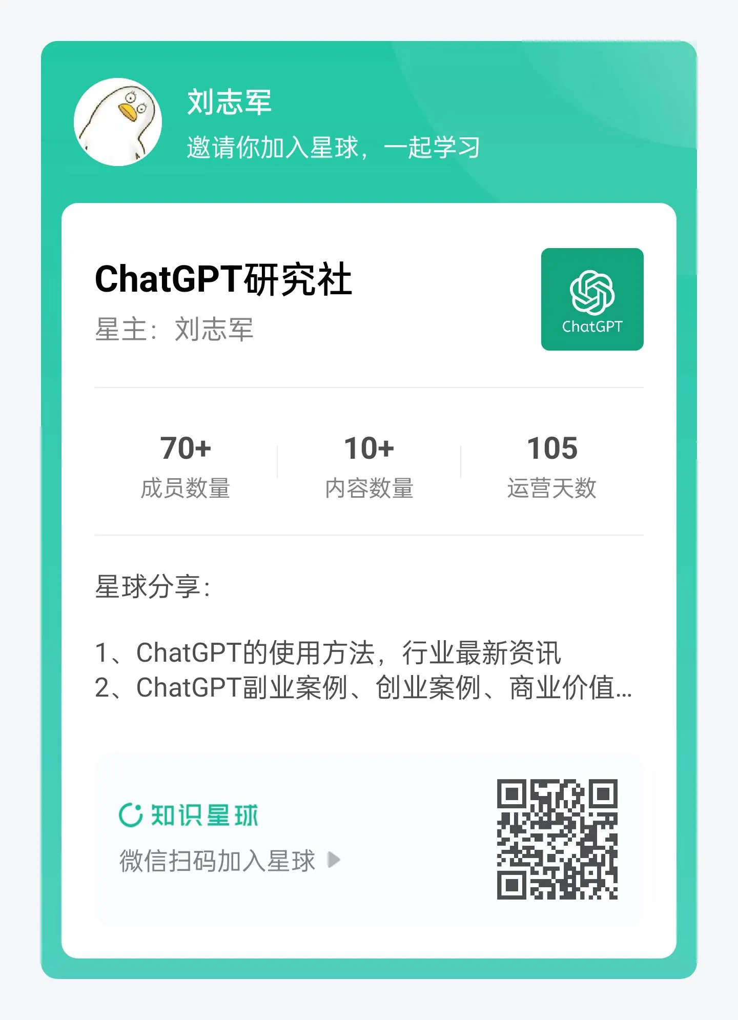 最后,推荐加入我的知识星球【ChatGPT运营社】,里面不仅有ChatGPT的保姆级教程,还有ChatGPT相关的副业案例、创业案例、商业价值分享。