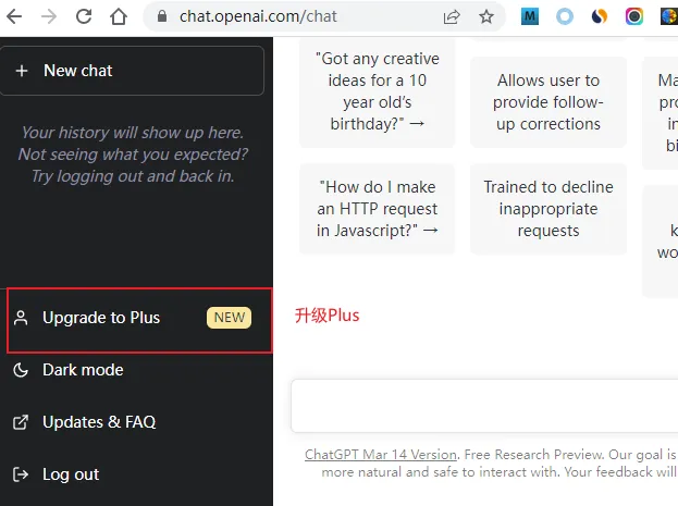 信用卡搞定后,终于来到最后一步开通ChatGPT Plus。登录ChatGPT账号后,左下角有个升级Plus的入口。