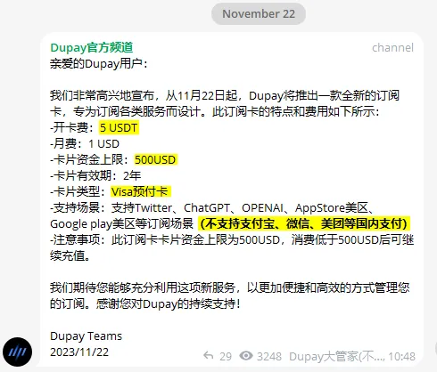 从2023年11月22日起,Dupay推出一款全新的订阅卡,专为订阅各类服务而设计,主打低门槛开卡,但有资金上限,并且不支持国内电商平台消费。鉴于Dupay原来的几个卡片开卡和充值成本上升,如果仅仅是为了订阅OpenAI/ChatGPT,也可以考虑开一张此类订阅卡(注意是VISA卡,可别开错了),且Dupay订阅卡无需KYC,适合对隐私要求较高的用户。