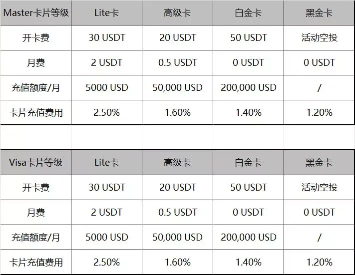 – 高级卡:开卡费20 USDT,最低充值30 USDT,建议提取60 USDT。