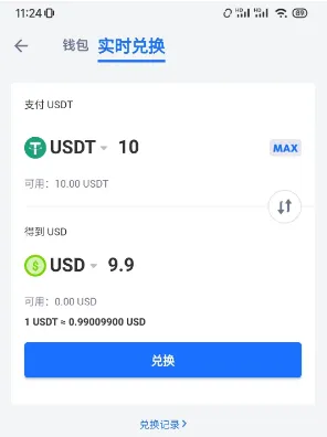 在Dupay钱包中,将USDT兑换成美元,路径为“Dupay App首页 > 钱包 > USDT > 兑换”。