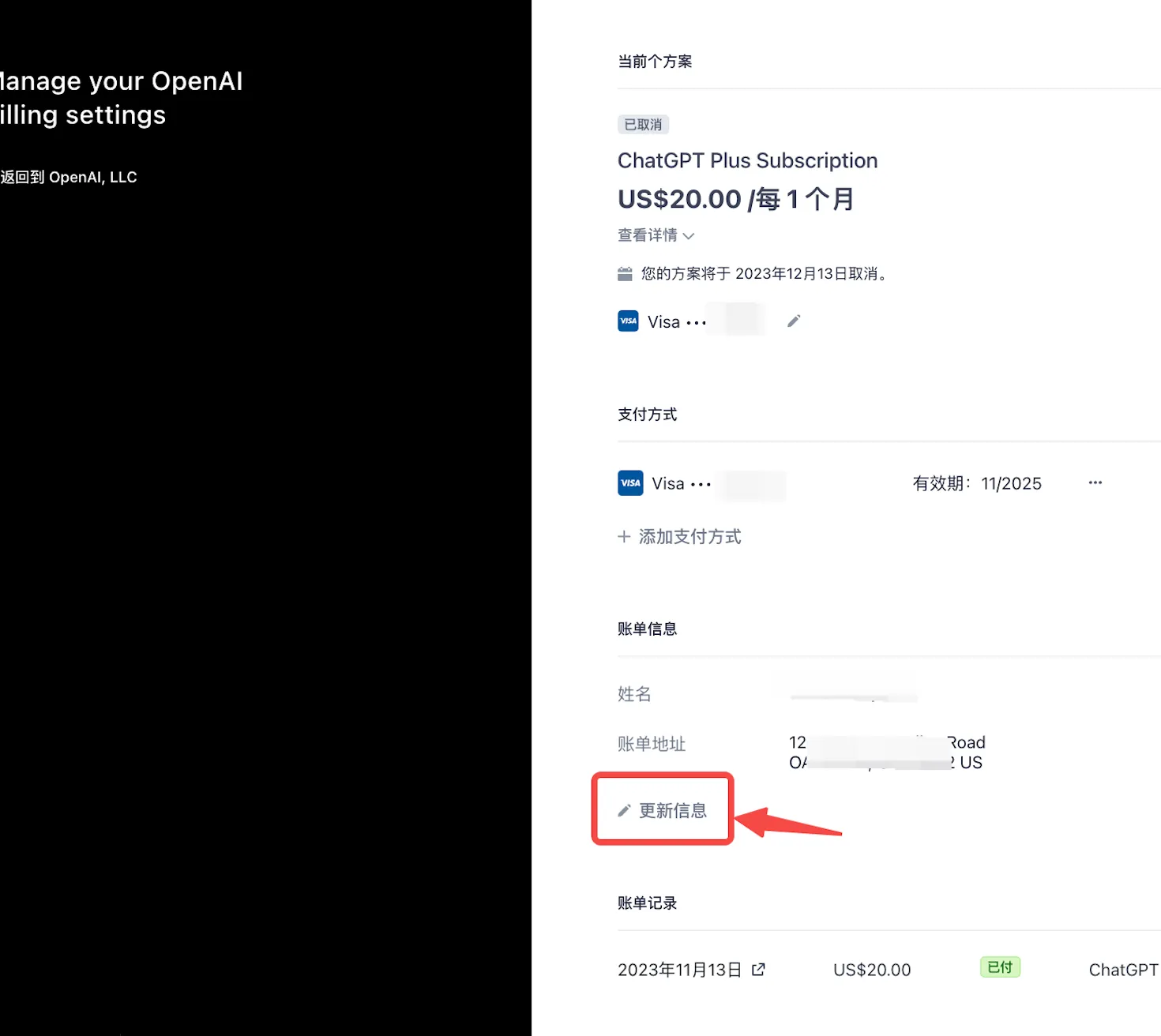 在支付管理页面,首先更新您的账单信息,点击「更新信息」。