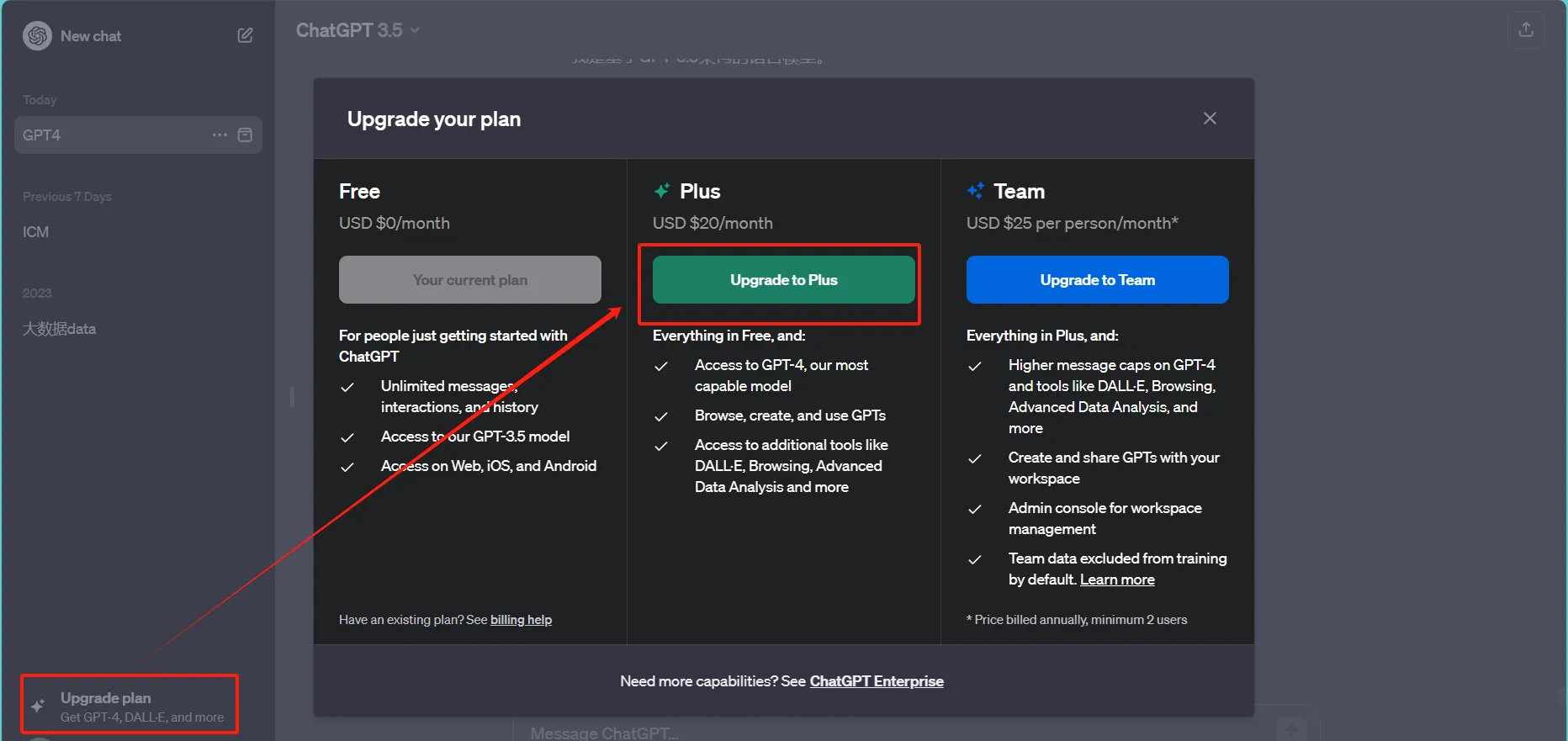 第二步: 点击界面中的 Upgrade to Plus,进入支付界面。