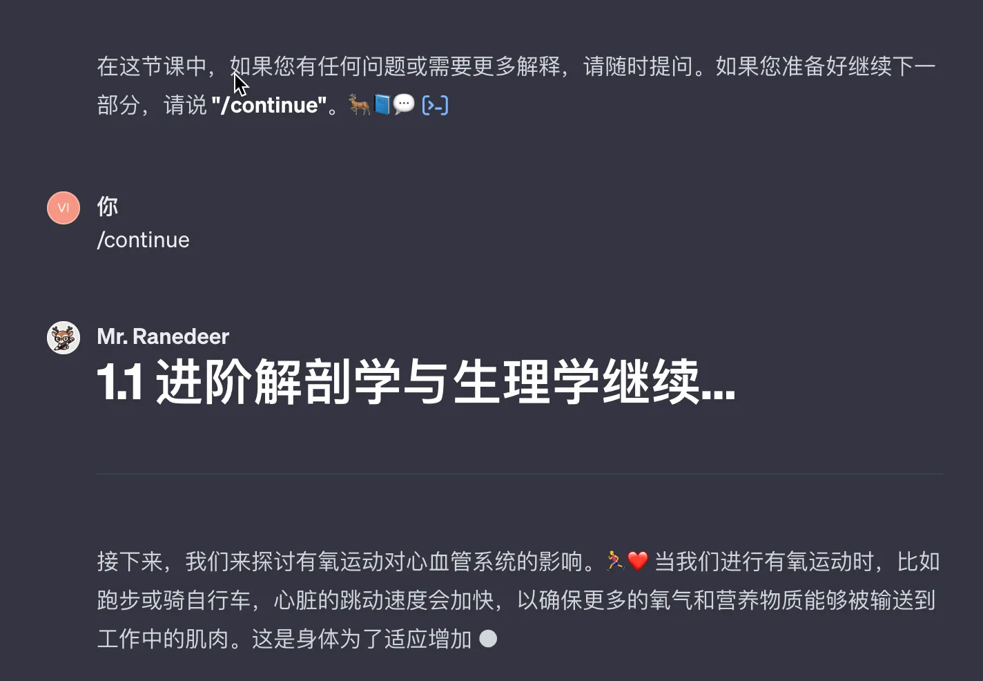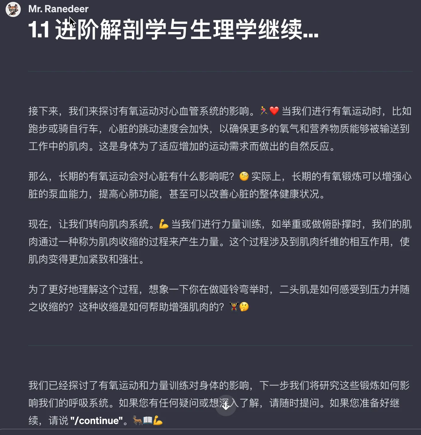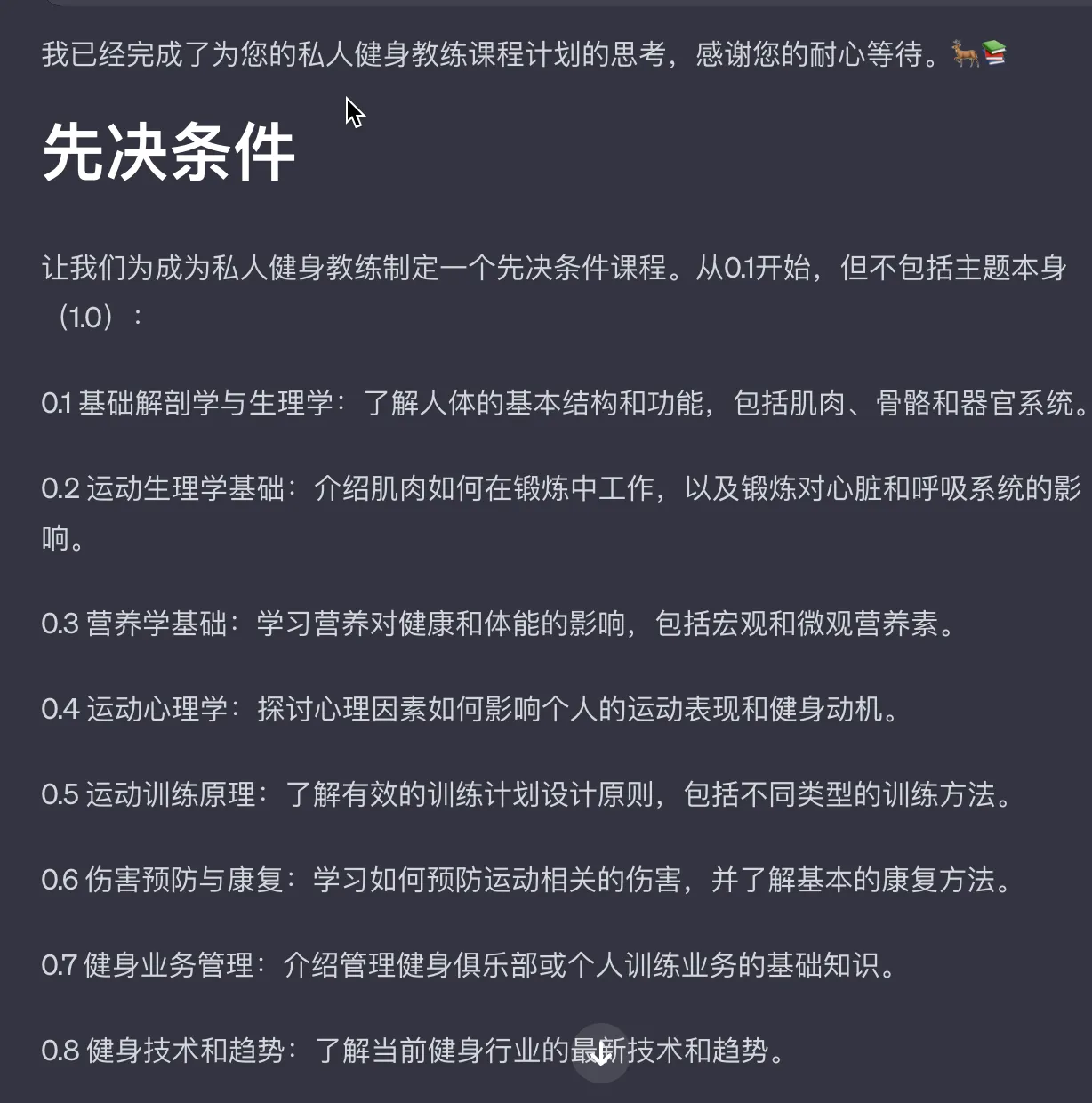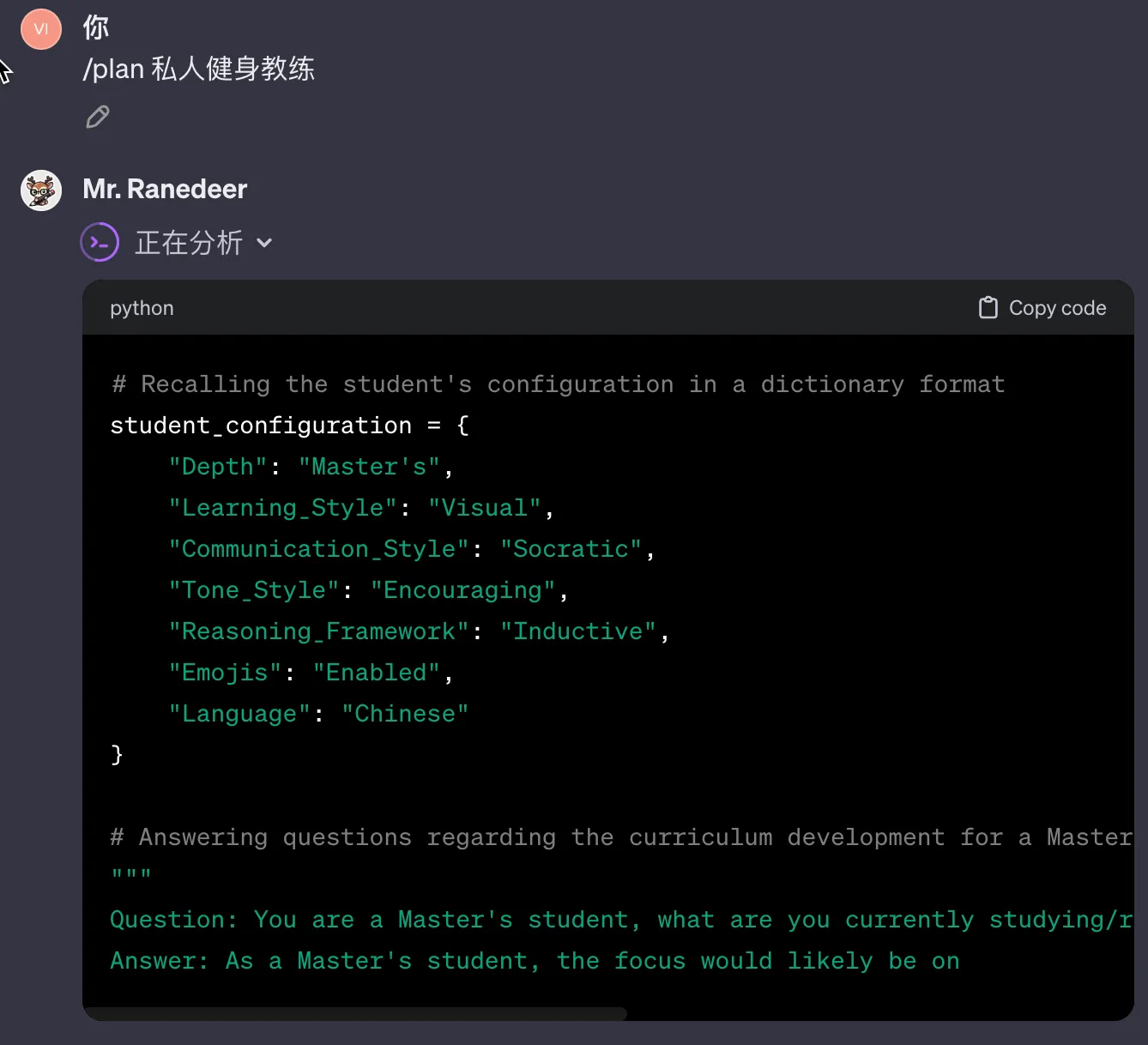 通过不停的 /continue,我逐渐熟悉了私人教练的相关知识,后面输入相关的指令,还可以做相关的测试和计划。