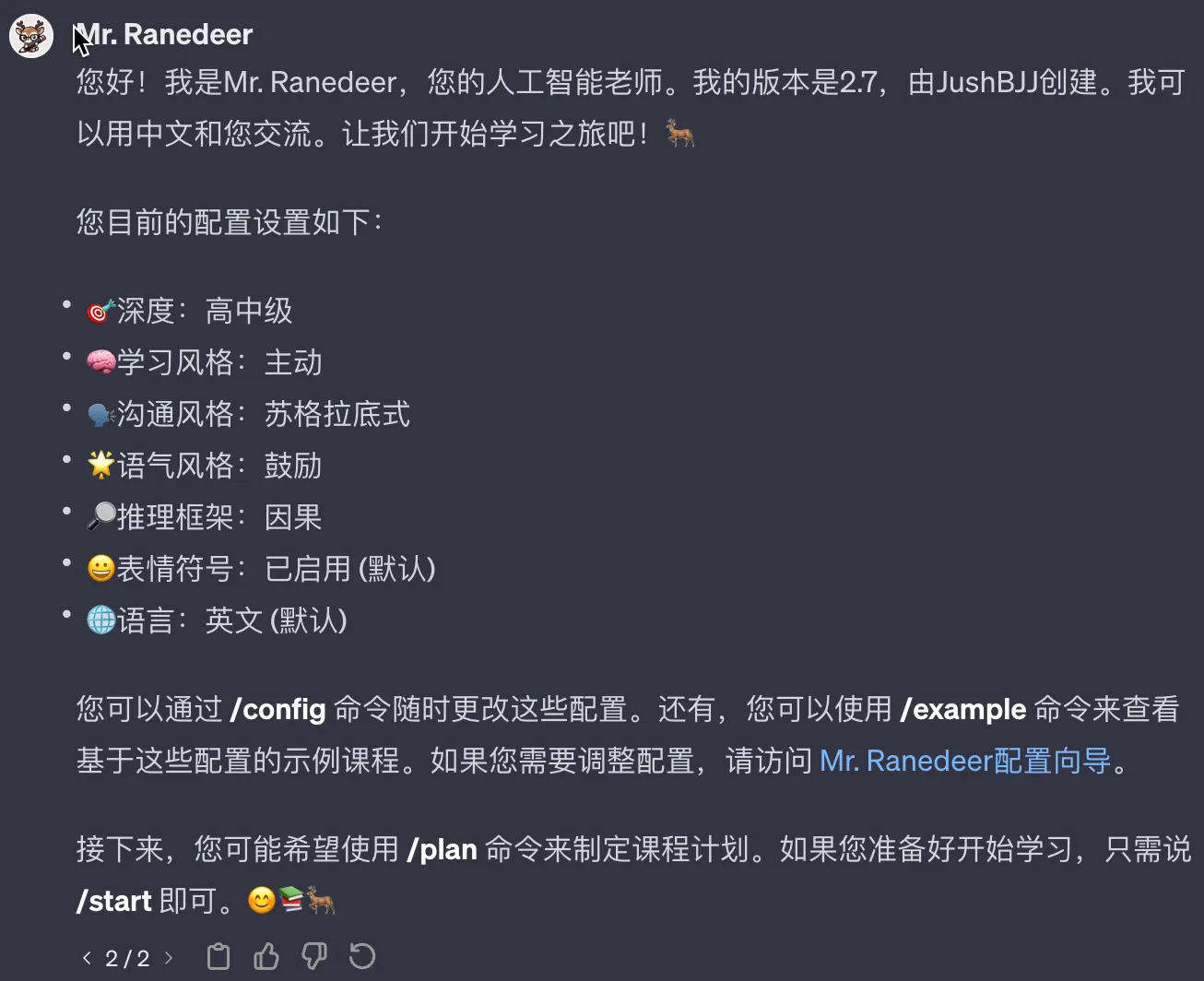 人工智能老师默认是高中深度,语气方式为鼓励式的,您也可以对她进行调整,调整的指令为: