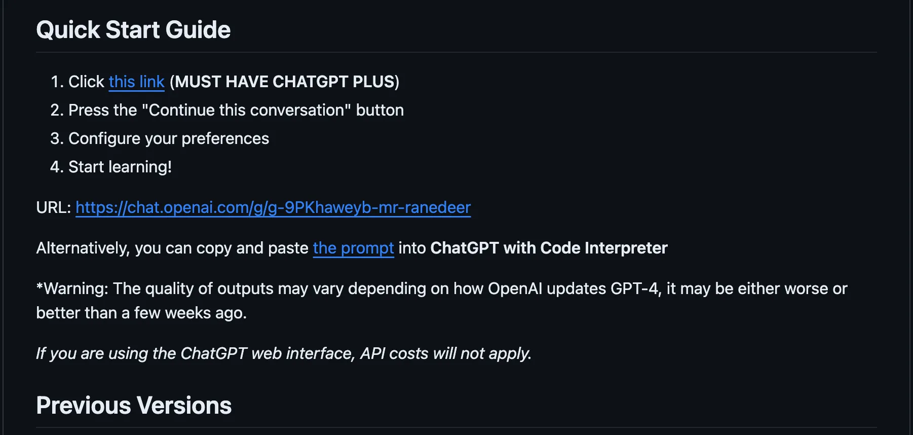 打开上述链接,直接点击 Quick Start Guide 中的链接,就可以跳转到您的 ChatGPT(需登录)。这里必须使用 ChatGPT Plus 才能体验这个功能,如果您还没有升级,可以参考一下这篇文章进行升级。