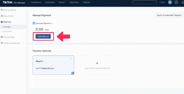 完成此部分后,您就可以为 TikTok 广告账户充值。在充值和付款页面上单击“添加余额”以开始运行广告系列。
