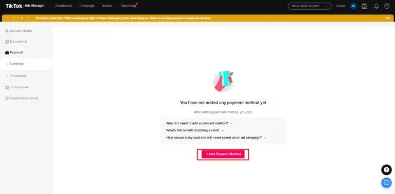 - 点击 TikTok 付款方式部分,选择添加付款方式。