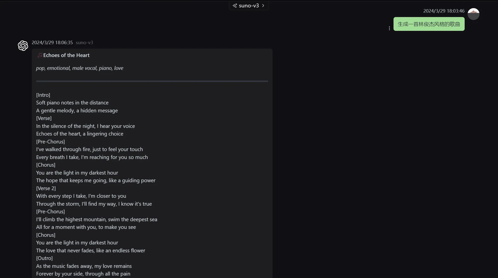 4. 我使用GPT帮助生成歌词,先让GPT学习我想创作的歌词特点,然后根据这些特点生成新的歌词。