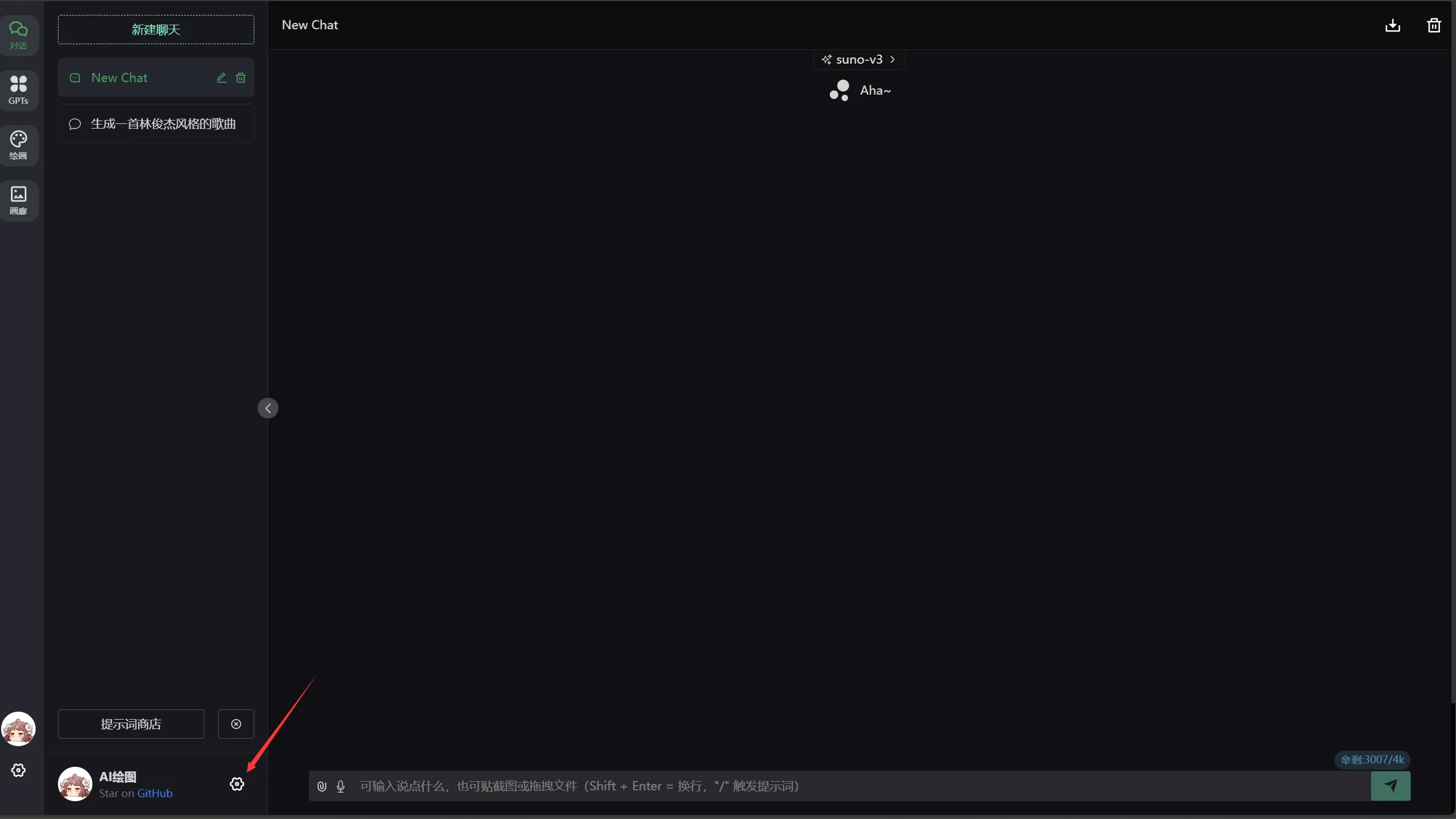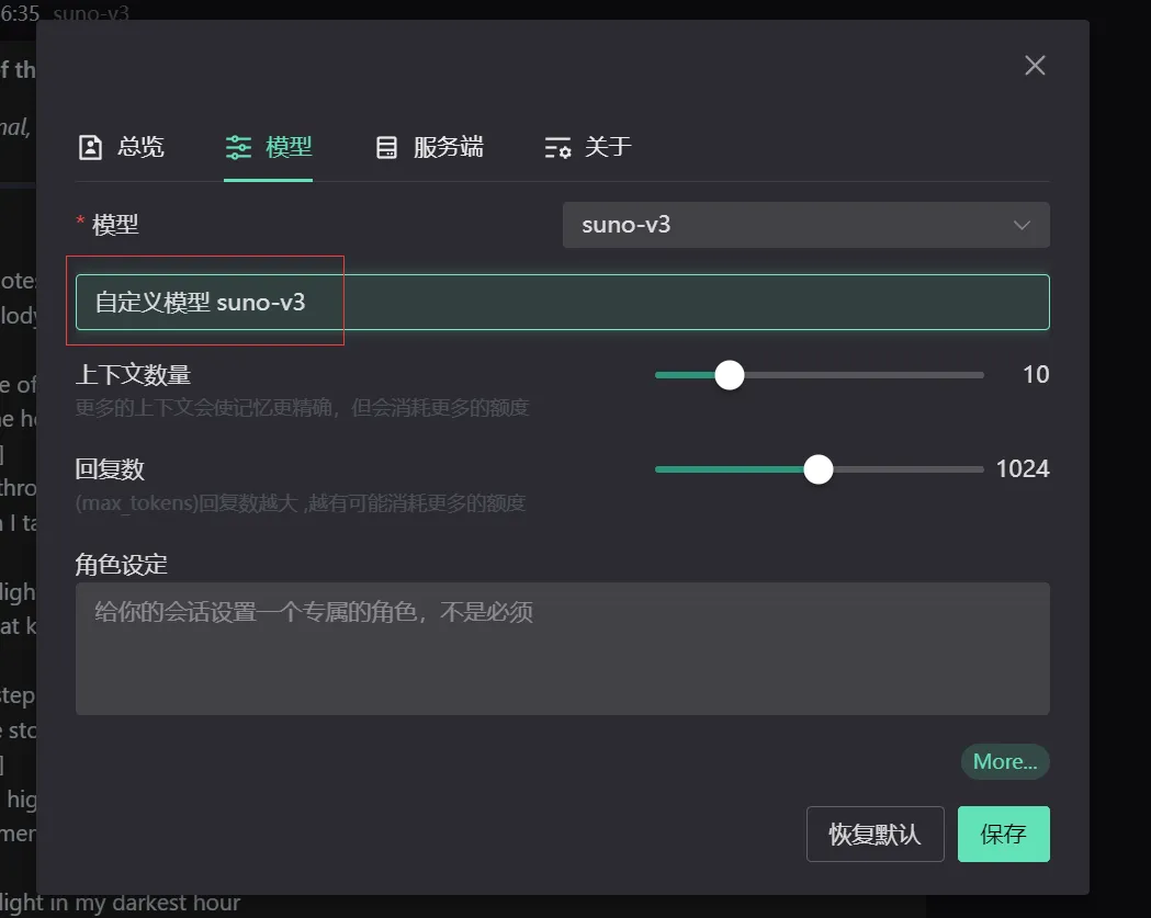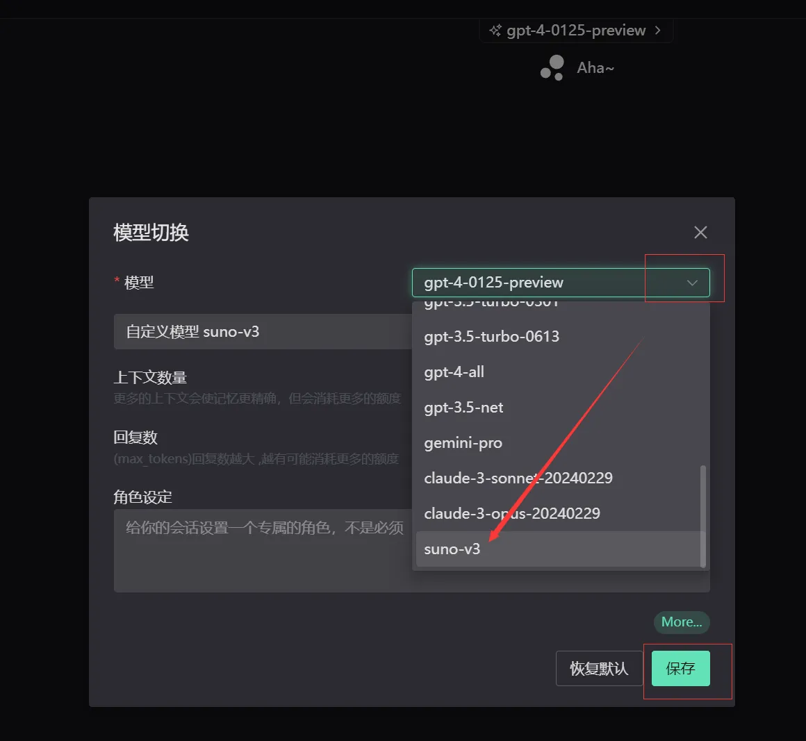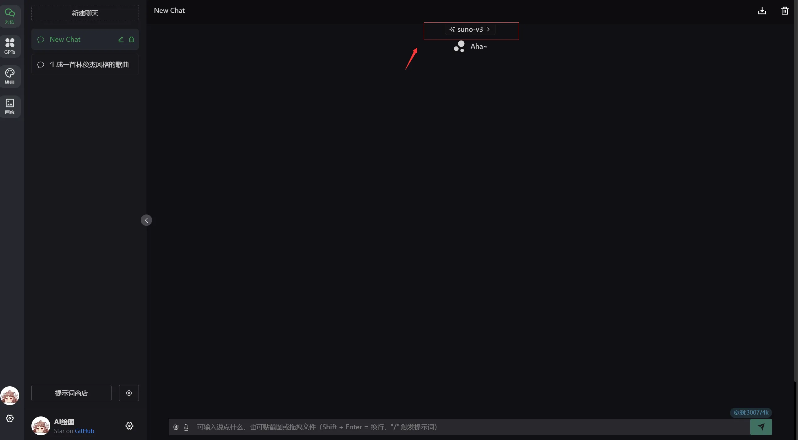 当聊天界面的模型变为suno-v3后,即配置成功。