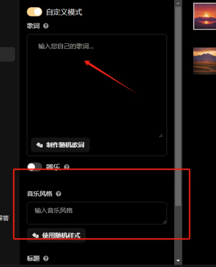 – **自定义歌词**:可以自己创作歌词,并填写音乐风格,如民谣、摇滚、轻音乐等。