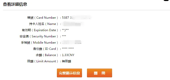 为了保护虚拟卡,系统默认不显示完整的卡号、安全码和到期日期。您可以点击“显示全部信息”按钮,并输入注册时使用的6位付款代码以查看详细信息。