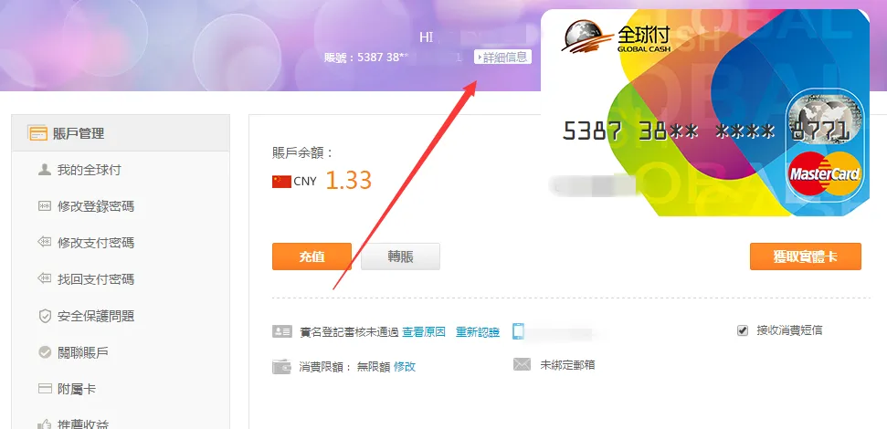 - 查看卡信息:点击顶部的[详细信息]按钮以查看您的万事达卡VCC信息。