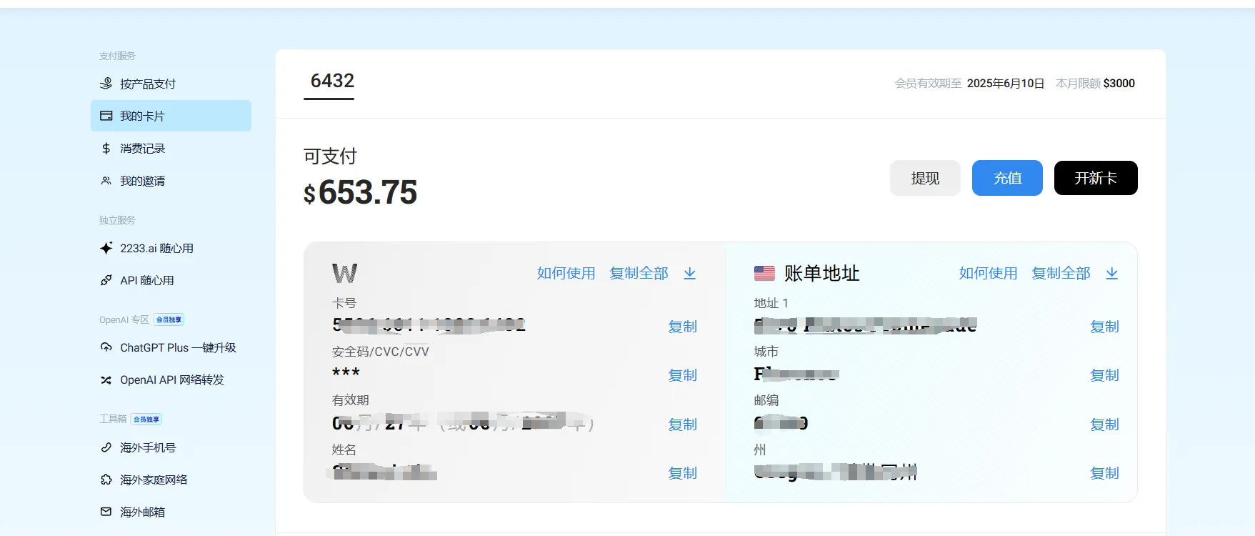 开通后,卡号、地址、安全码等信息可以直接复制使用,返回OnlyFans填写对应的信用卡信息即可。