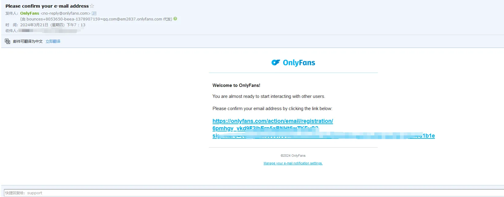 第三步:邮箱验证及账户激活。在填写完注册信息后,点击注册,OnlyFans会向你的邮箱发送确认邮件。
